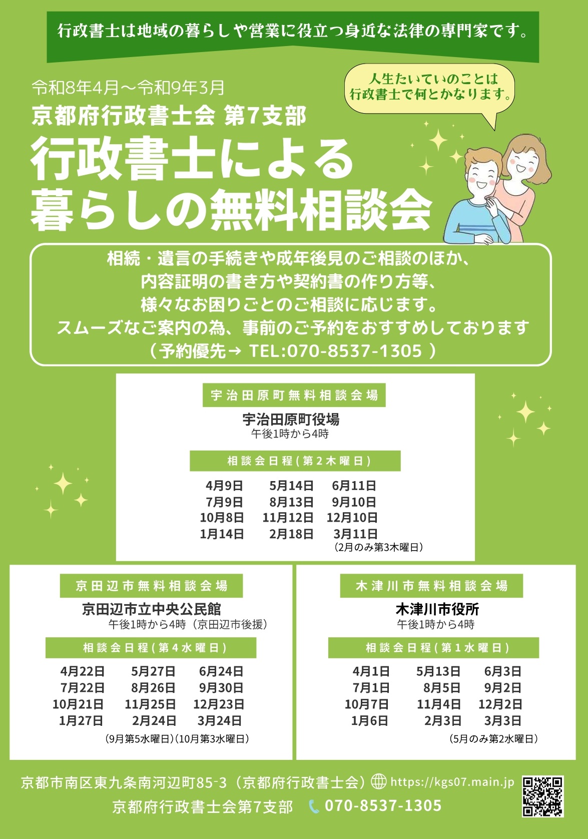 宇治田原町会場では、日常生活の身近な問題や不安について、行政書士が分かりやすくアドバイスを差し上げます。お気軽にご来場ください。